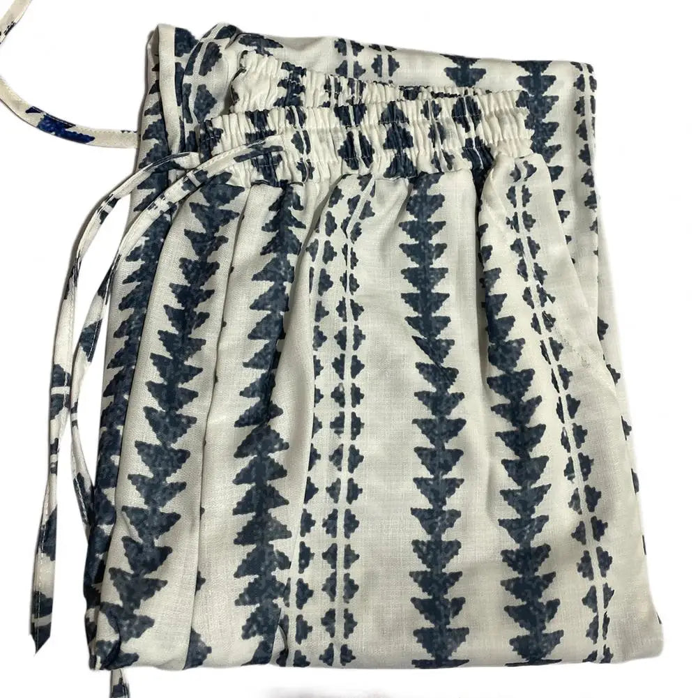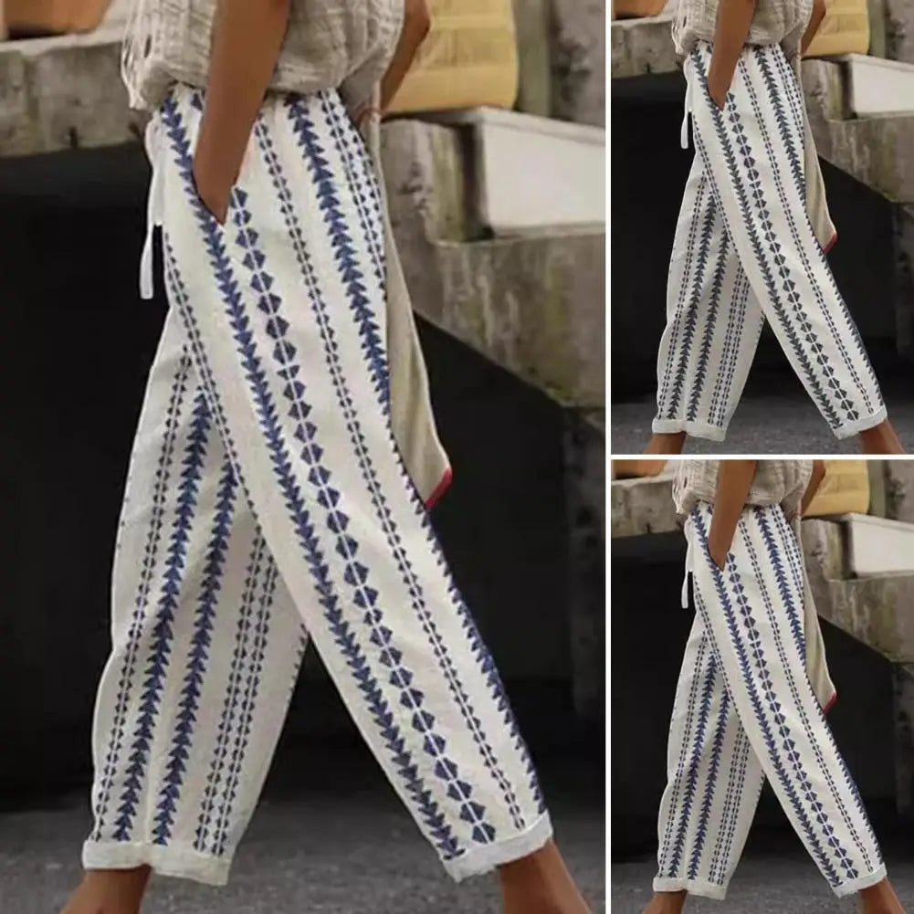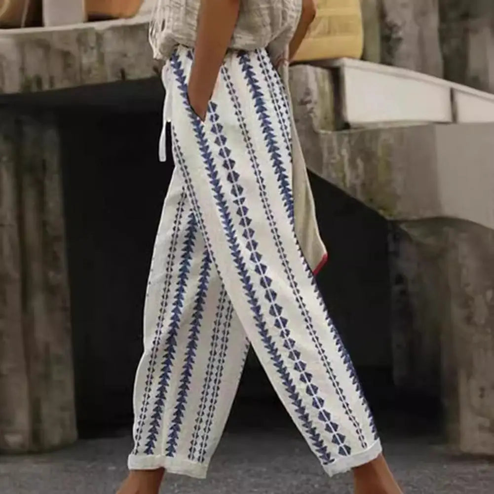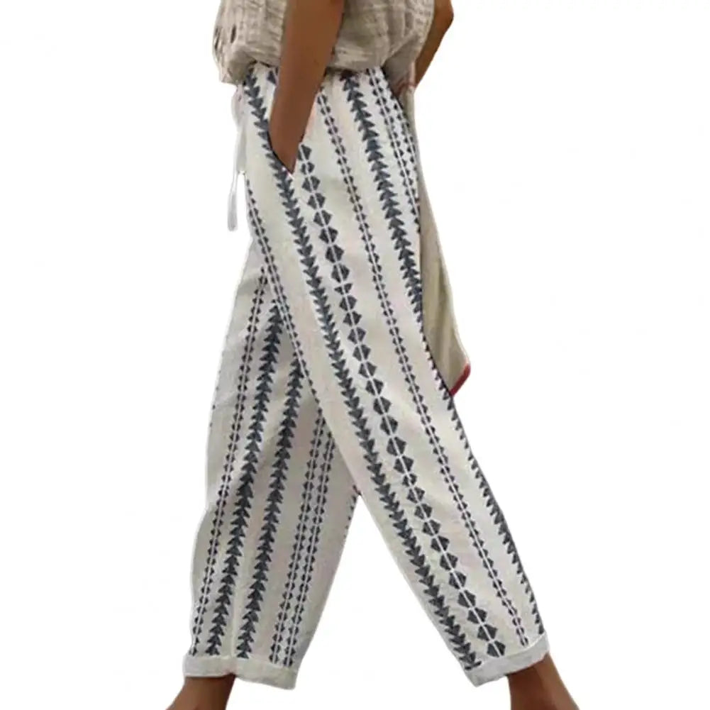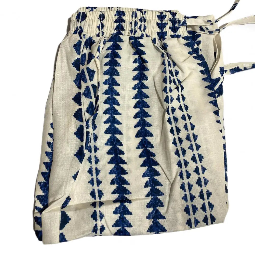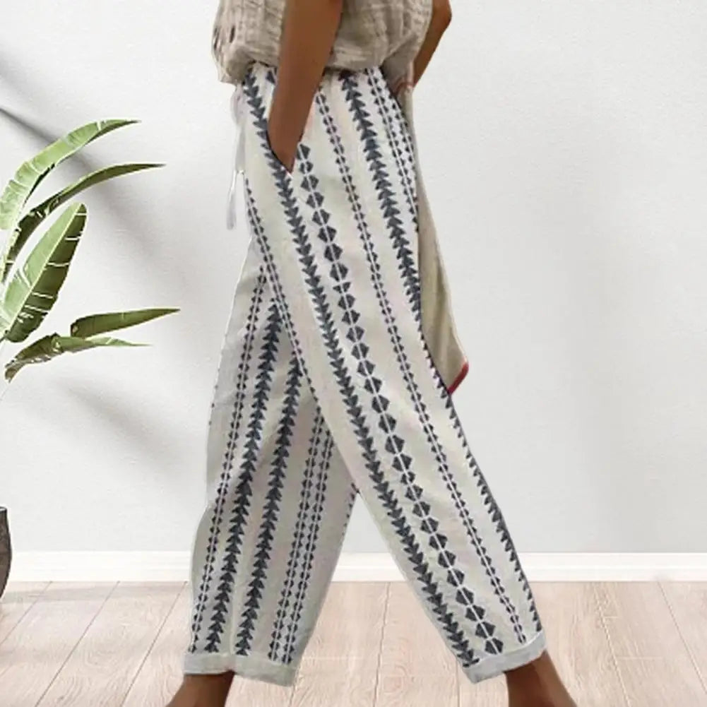 הדגם עשוי מחומר מעורב של ספנדקס עם אלסטיות לא נמתחת, בגזרה רחבה ושטוחה בחזית. המכנסיים מצוידים בכיסים ומיועדים לעונת הקיץ. המותן במידה בינונית עם סגירת שרוך, ומעוטרים בהדפס גיאומטרי מודרני. מכנסיים באורך מלא המתאימים לסגנון קז'ואלי.